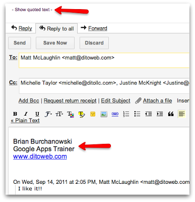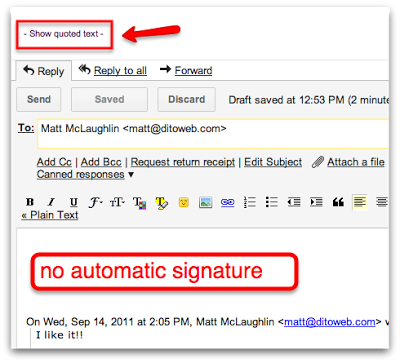 Also, you will notice that your signature by default is not always automatically placed under your response once the conversation has begun. Gmail will place your signature at the bottom of the repetitive text to keep the conversation direct and not interrupted by multiple signatures.