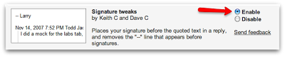 The lab we are featuring today allows you to place your signature at the bottom of every response you send, even in a conversation thread. This lab is called ‘Signature Tweaks’. To enable this lab, simply locate the ‘Labs’ section under ‘Mail Settings’ and click the radio button next to the the lab titled ‘Signature Tweaks’, then click ‘Save Changes.’