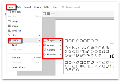 Users now have the ability to create diagrams, charts, and flowcharts within a presentation.  To access these new drawing tool functions simply click on ‘Insert’ and then click on ‘Shapes.’  Here, you have the option to add shapes, arrows, callouts, and equations.