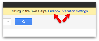 Once the vacation responder has been turned on and is active, you will see a banner at the top of your screen with the options for you to turn off the responder (End Now) and/or edit the responder (Vacation Settings).  This is a quick and easy way to make any necessary changes without a bunch of clicks.
