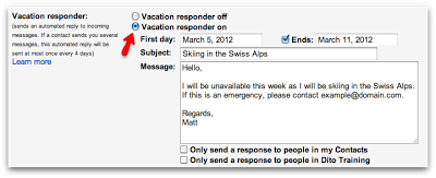 A few very important characteristics of the out of office reply/vacation responder in Google Apps are: