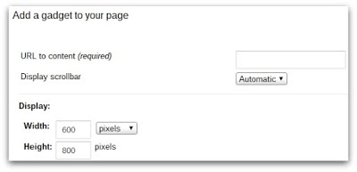 7. Within the iframe gadget parameter screen, paste the “publish” URL that you copied from the flash host. Adjust the width and height that matches your flash.
