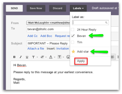 Another way to confirm that your choices were applied to the message is to wait until Bevan replies to this message. A conversation will begin to form and the label & star will be applied to that conversation.