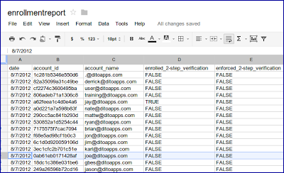 If you’ve had 2SV enabled in your domain for some time, you may already have users enrolled. Google provides you with a report listing all the users in your domain, whether they have 2SV enabled and whether 2SV is enforced for their account. To see the report, just login to your Google Apps Control Panel and Navigate to Reports -> Additional Reports. The “2-Step Verification Enrollment Report” is the last one on the page. I recommend downloading it and then uploading the file to Google Drive as a Spreadsheet for easy analysis.