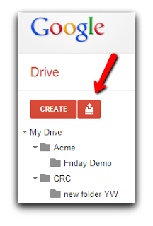 The other option when uploading files in to Google Drive is the Upload Button.  This can’t miss red button is located next to the ‘Create’ button on the Google Drive home page.