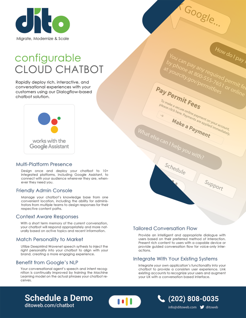 Dito is a Google Cloud Premier Partner that focuses on end user & data migration, IT modernization, and ongoing services for organizations interested in leveraging Google’s cloud infrastructure, data warehousing, location services, and productivity suite to transform and scale their business. Request more information at https://www.ditoweb.com/chatbot